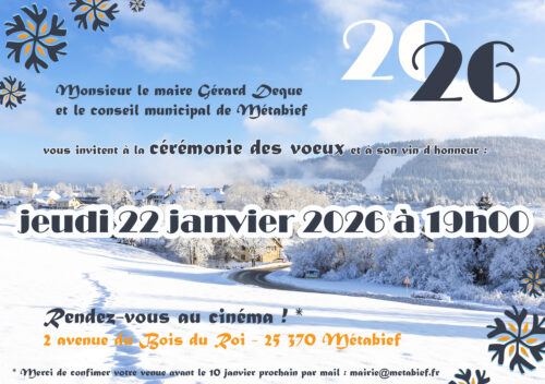 MenuAIDES & SOLIDARITÉEspace personnelAide communale aux habitantsParticipation sport jeunesFête de Noël et cadeaux aux enfantsFête des mèresFête des pèresPaniers des seniorsCCASPersonnes en situation de handicapENFANTS, ÉDUCATION & JEUNESSEÉtablissements scolairesAccueil de LoisirsPériscolaire / ALSH / Restaurant scolaireGarderie multi-accueilAssistantes maternellesAires de jeuxVOTRE MAIRIEMAIRIEAnnuaire et horaires des servicesVos élusVIE MUNICIPALEConseils municipauxArrêtésBudget communalJournaux communauxPOLICEFourrière véhicules & animauxAutorisation route du MorondLutte contre les nuisances sonoresRespect du déneigementInterdiction du brûlage de déchetsObjets trouvésVOS SERVICESACTES ADMINISTRATIFSActe de naissanceReconnaissance d’un enfantMariage et PACSActe de décèsAttestation d’accueilCarte d’identité & passeportInscription sur les listes électoralesCertificat domicile frontalierHABITAT & URBANISMEAffichage urbanismePlan local d’urbanisme actuelRévision du Plan Local d’UrbanismeDemande de travauxDÉCHETSCollecte des ordures ménagèresPoints d’apport volontaireDéchèterieCompostageSOCIO-PROFESSIONNELSProfessionnels de santéCommercesArtisansNuméros utilesAUTRESEnseignes publicitairesElectricité / Eau / Assainissement / Télécoms / FibreVente annuelle de boisLes Jardins PartagésLocation de sallesTOURISMETOURISME, CHARTES & LABELSPlan du villageDéclaration location de tourismeCamping-Car ParkBorne pour voiture électriqueStationnement & ParkingsMobilitésChartes et labelsSPORT & CULTURECULTUREMédiathèqueMusée de la meunerieEspace de vie socialeCinémaFestival de la PailleÉQUIPEMENTS LUDIQUES & SPORTIFSTerrain de footBoulodromeSalle multi-sports (Dojo Gilbert Gruss)PumptrackAires de jeuxLOISIRSStation de ski / VTT / Luge 4 saisonsÉcole de VTTÉcoles de skiSentier du MorbierParc Métabief AventuresCentre ÉquestreParapenteASSOCIATIONSListe des associationsDemandes de subventionsOrganisation d’événementsAnnuaire et horaires des servicesPrise de RDV en ligneActualités