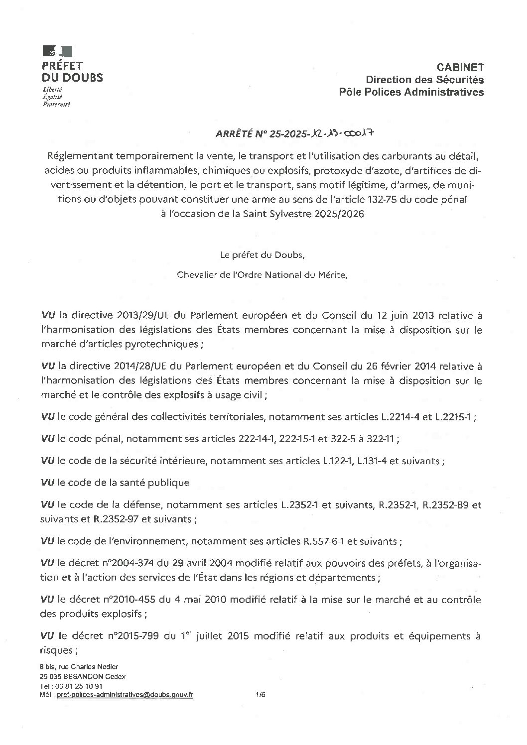 Article 1er : Sont âinterditsâ sur l'ensemble du dĂ©partement du Doubs, du mardi 30 dĂ©cembre 2025 Ă 20h00 jusqu'au vendredi 2 janvier 2026 Ă 6h00, la distribution, la vente et l'achat de carburants dans tout rĂ©cipient transportable, sauf nĂ©cessitĂ© dĂ»ment justifiĂ©e par le client et vĂ©rifiĂ©e, en tant que de besoin, avec le concours des services de police locaux. Les dĂ©taillants, gĂ©rants et exploitants de stations services, notamment de celles qui disposent d'appareils automatisĂ©s permettant la distribution de carburants, doivent prendre les dispositions nĂ©cessaires pour faire respecter cette interdiction.