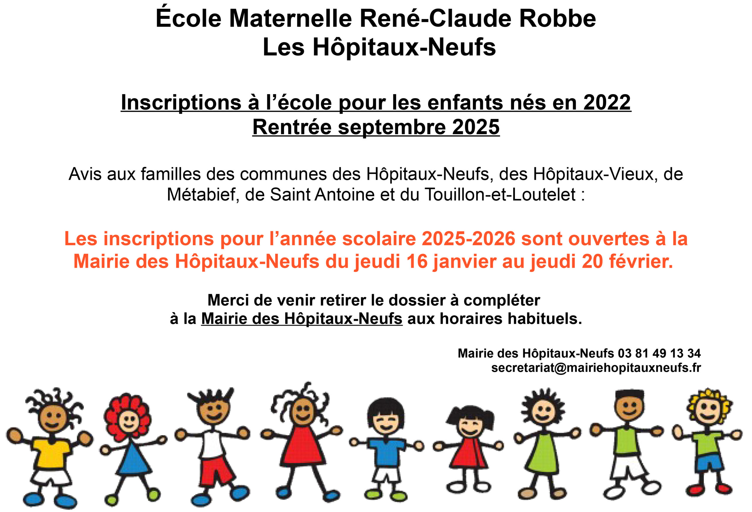 Les inscriptions pour l’année scolaire 2026-2027 sont TOUJOURS POSSIBLES à la Mairie des Hôpitaux-Neufs !