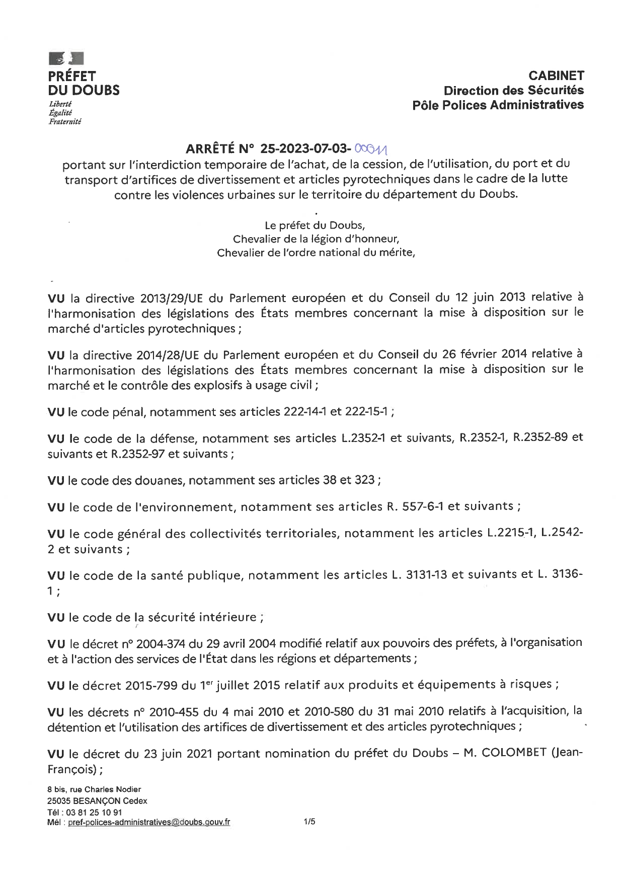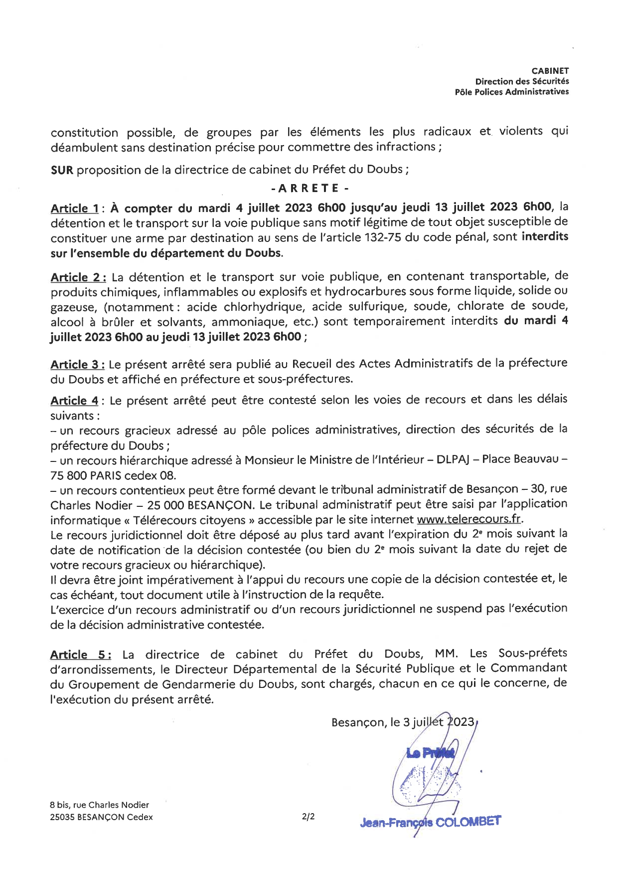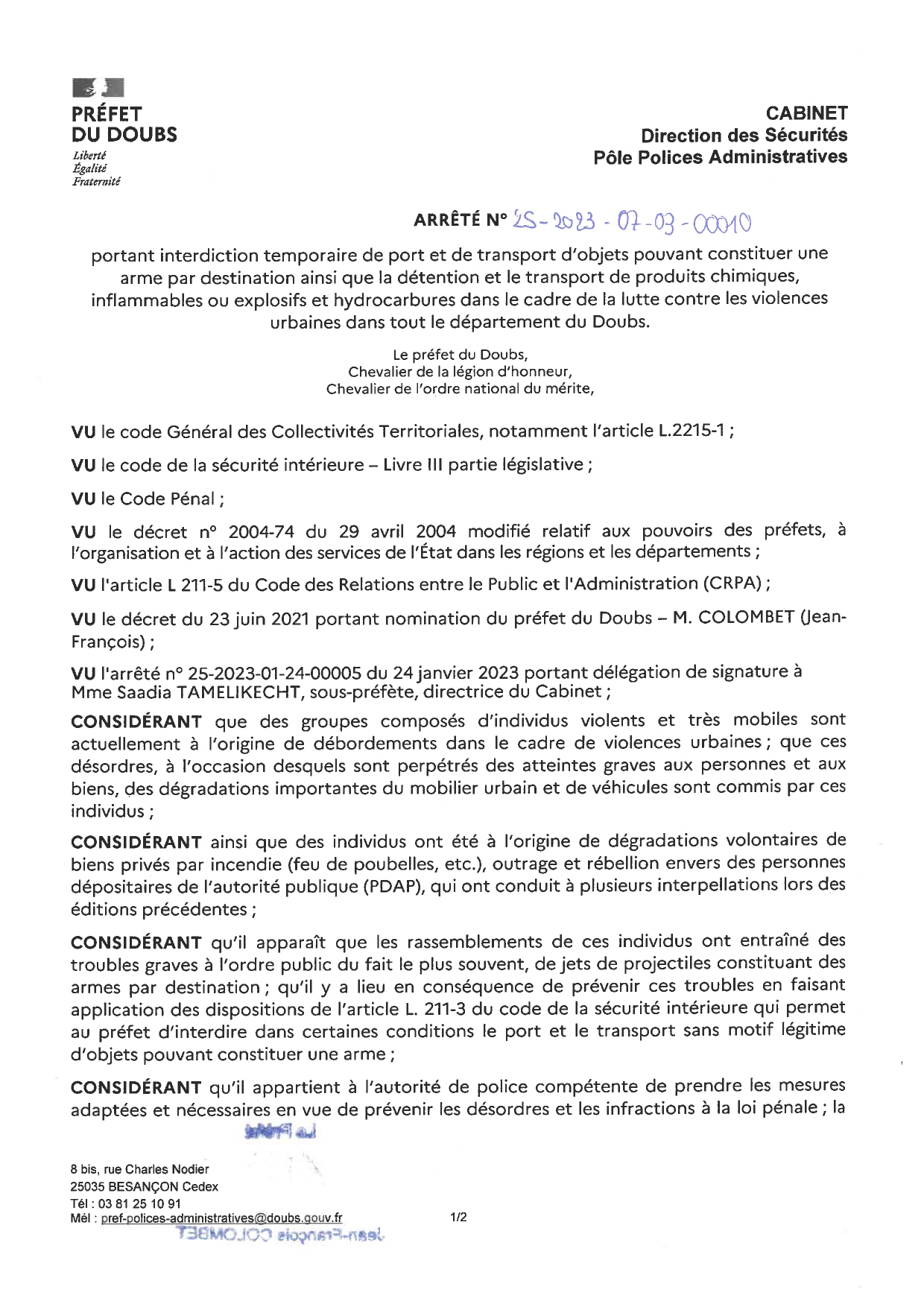 05/07/2023Je vous prie de trouver ci-joint les arrêtés de prolongation des mesures prises dans le cadre des violences urbaines, pour ce qui concerne les armes par destination et les artifices de divertissement.