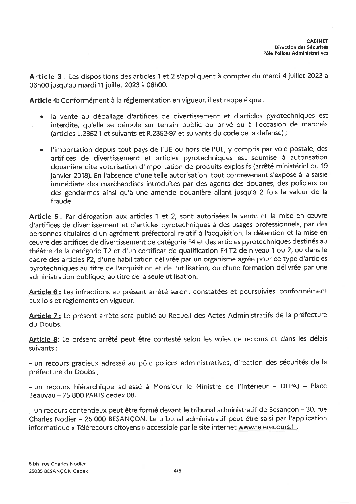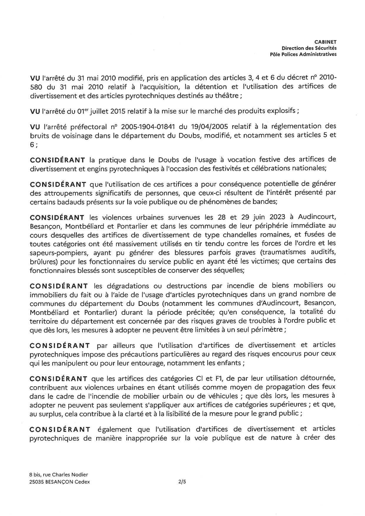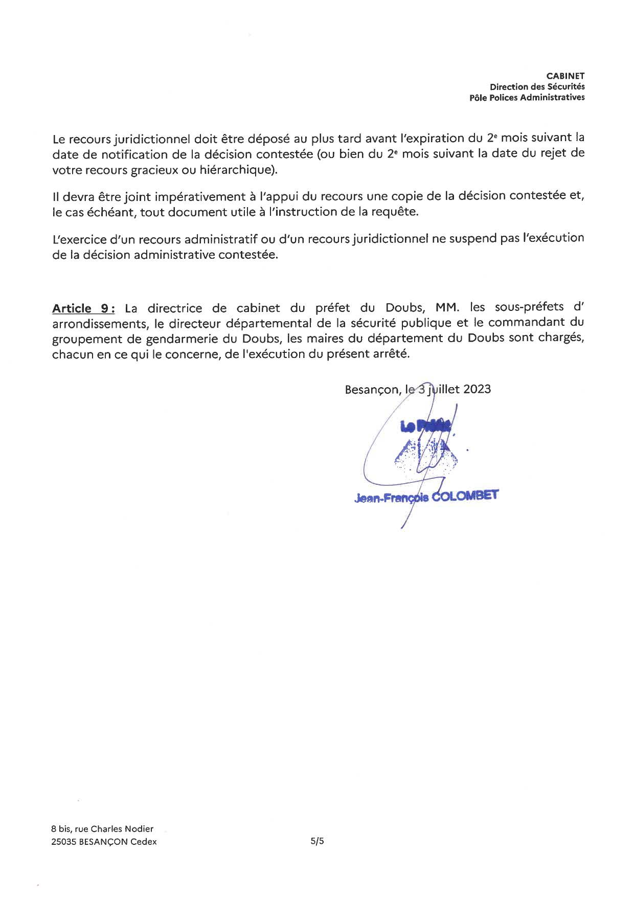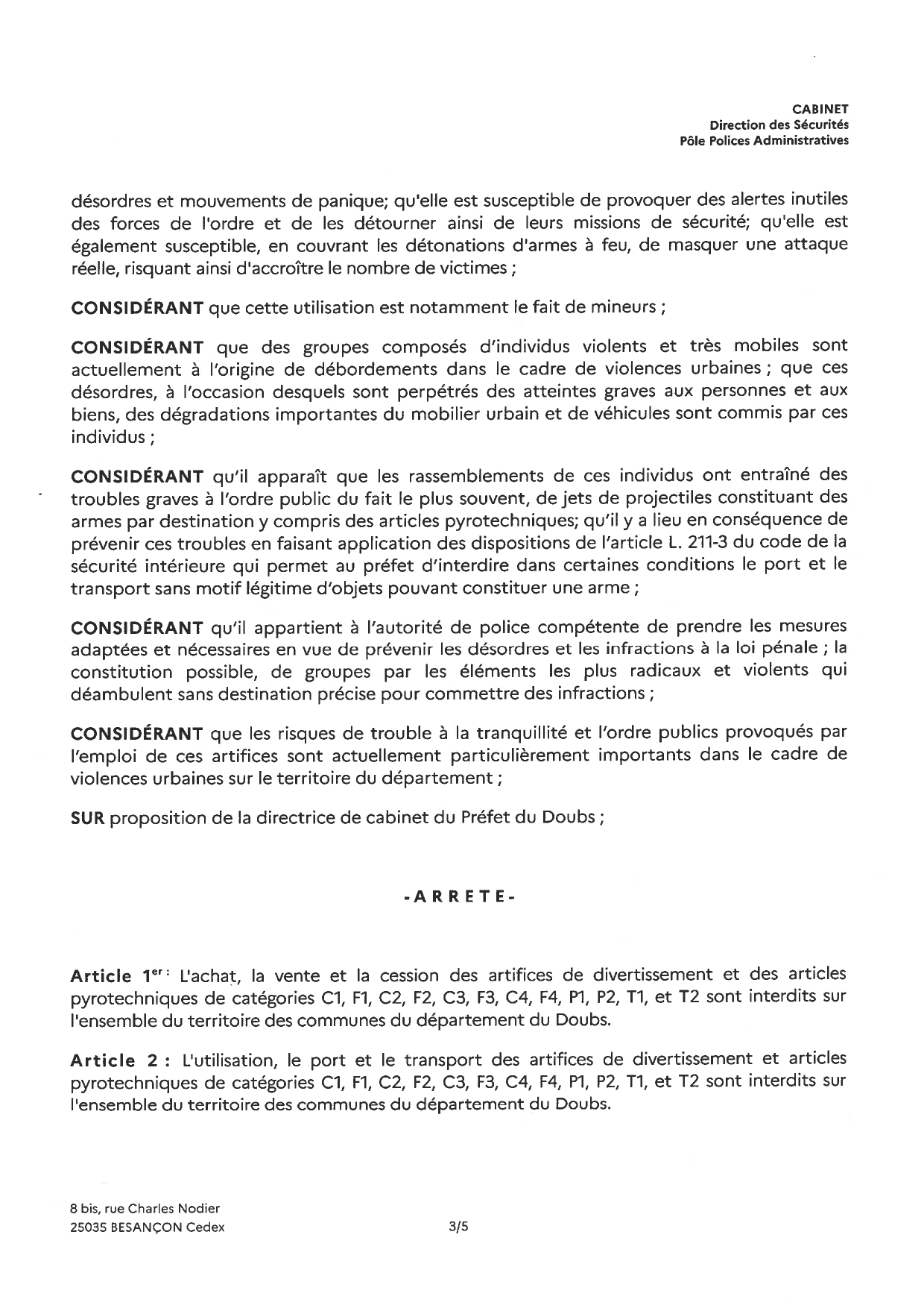 05/07/2023Je vous prie de trouver ci-joint les arrêtés de prolongation des mesures prises dans le cadre des violences urbaines, pour ce qui concerne les armes par destination et les artifices de divertissement.