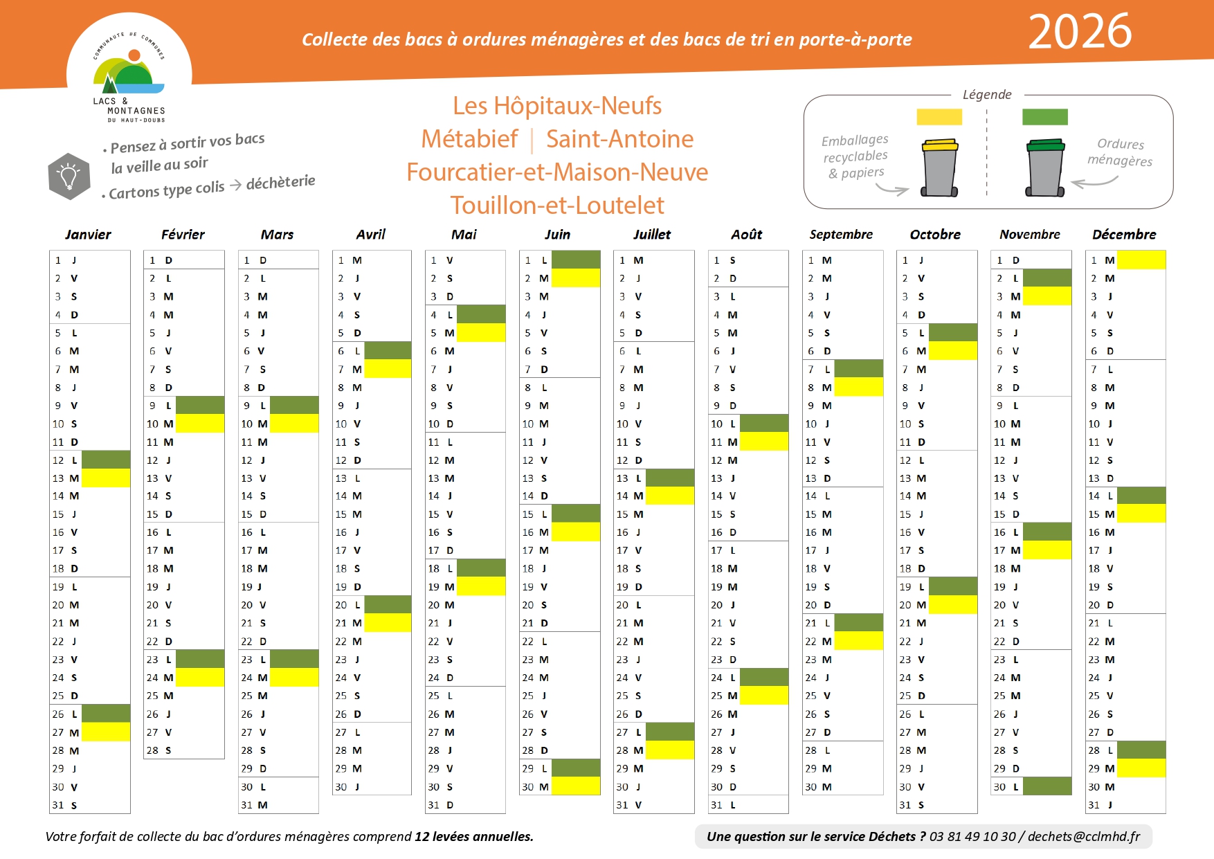 Pêche en eau douce 202611/12/2025 Le calendrier 2026 concernant la collecte des déchets est disponible. Retrouvez-le ci-dessous ainsi que toutes les informations complémentaires liées Service Déchets - CCLMHD #mairiemetabief #COLLECTEDESDECHETS Partager sur Contenu similairePêche en eau douce 2026En savoir plusPLU : Contributions à l’enquête publiqueEn savoir plusSoirée « Mamans » – organisée par le CLAJ des Sapins de l’AmitiéEn savoir plus