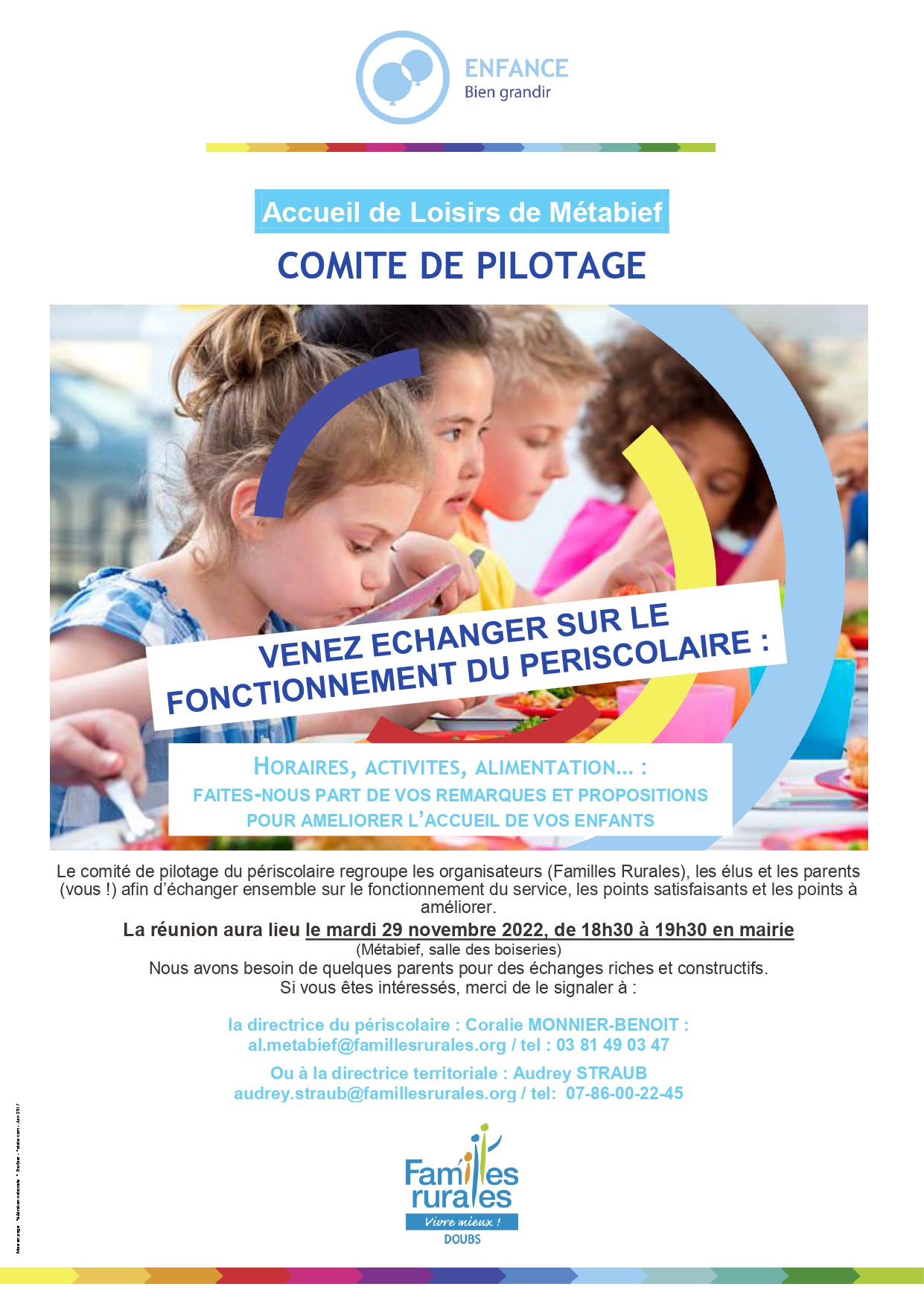 23/11/2022Afin d’échanger sur le fonctionnement du périscolaire, une réunion se tiendra le mardi 29 novembre 2022, en mairie dans la Salle des boiseries, de 18h30 à 19h30.