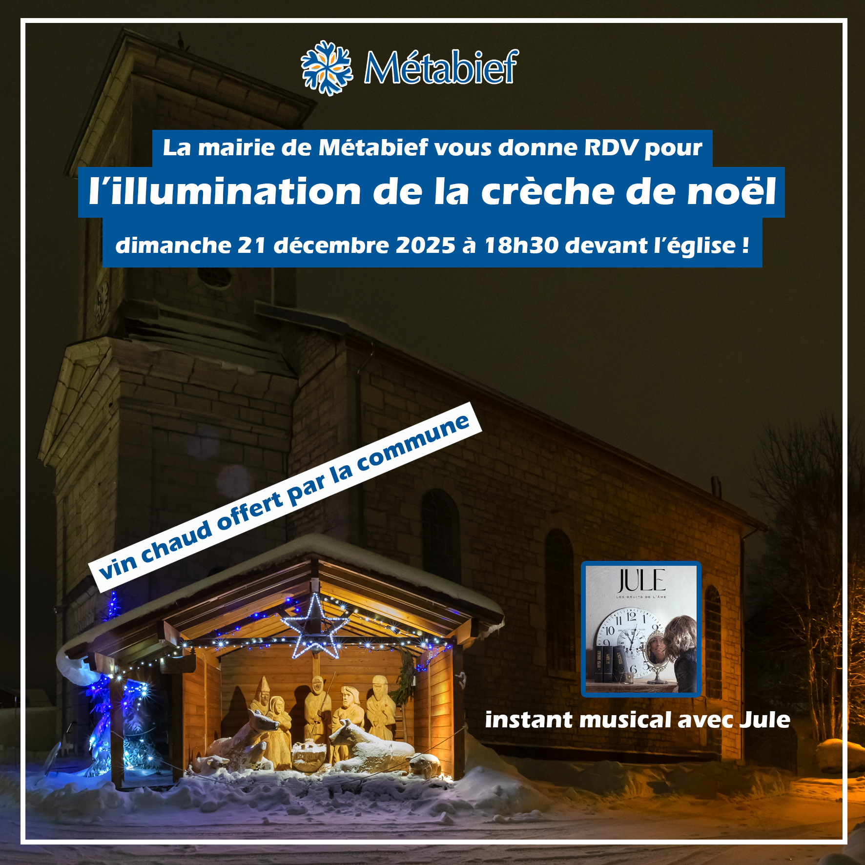 PLU : Procès Verbal de synthèse des contributions à l’enquête publique16/12/2025 Illumination de la crèche de noël La Maire de Métabief vous donne RDV pour l'illumination de la crèche de noël : Dimanche 21 décembre 2025 à 18h30 devant l'église Venez nombreux ! Partager sur Contenu similairePLU : Procès Verbal de synthèse des contributions à l’enquête publiqueEn savoir plusINFORMATIONS IMPORTANTES – EAU POTABLEEn savoir plusCalendrier 2026 concernant la collecte des déchetsEn savoir plus