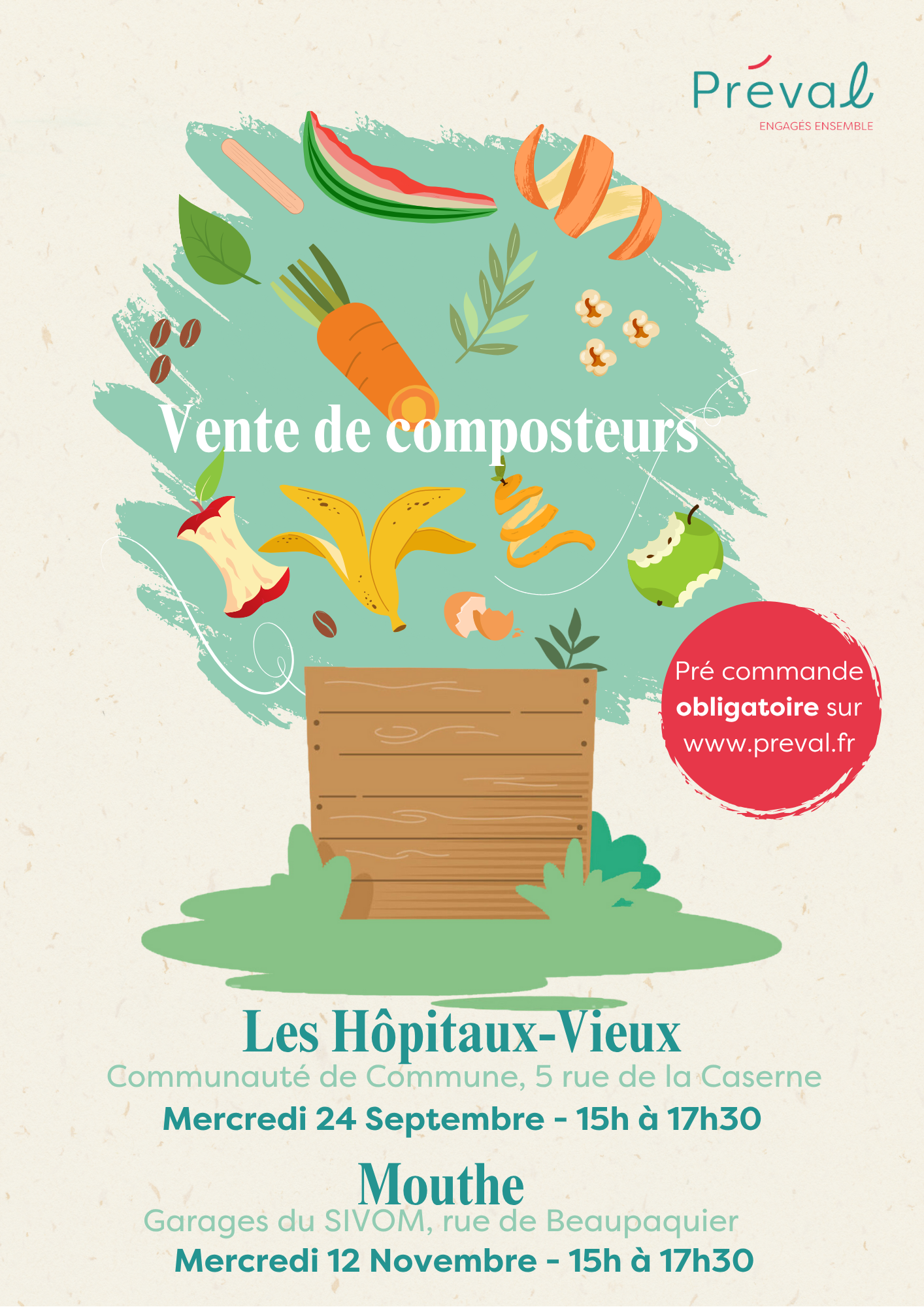 [Info Musée] – Journée du Patrimoine 202519/09/2025PEL – Automne 202519/09/2025 Ventes de composteurs - Nouvelles dates Les composteurs seront bientôt disponibles à la vente pour cette fin d'année 2025 Les pré-commandes sont indispensables auprès des services de Préval avec un règlement depuis leur site internet : Préval Haut Doubs. 📆 Ils seront à retirer à la ComCom LMHD aux Hôpitaux Vieux le mercredi 24 septembre ou à Mouthe le 12 novembre. Partager sur Contenu similairePERMANENCES CIDFF – Les dates pour le premier trimestre 2026 sont connuesEn savoir plusConseil municipal du 08 décembre 2025En savoir plus[Cinéma] – Séance Séniors ADMREn savoir plus